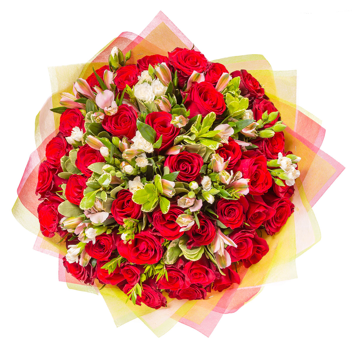 Роза кустовая красная, альстромерия розовая, гвоздика кустовая мини белая, зелень. Упаковка (лента, пленка, крафт, сетка, пленка матовая)