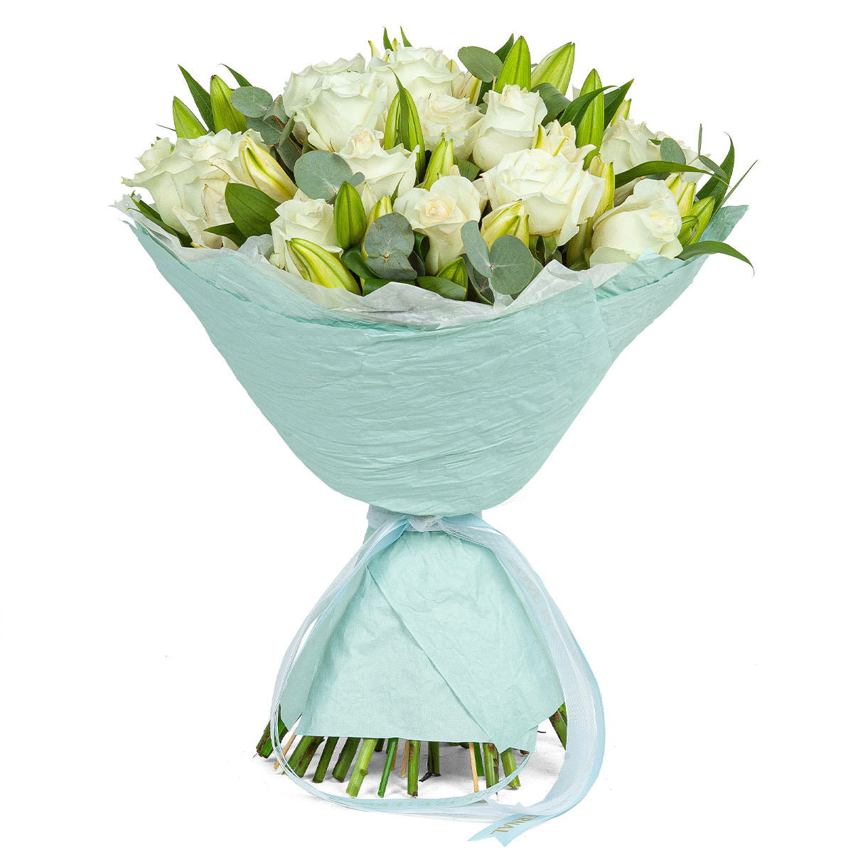 Роза одноголовая белая, лилия белая, эвкалипт. Упаковка (лента, пленка, крафт, сетка, пленка матовая)